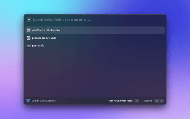 Depending on your configuration Raycast will ask for text input you want to provide to the Drafts Action or run the Action without any text input.