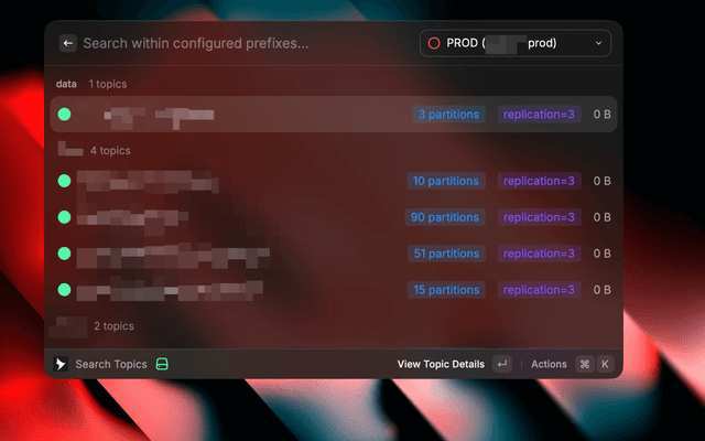 This extension connects to your Kafka UI instances and provides quick access to consumer group lag monitoring and topic browsing directly from Raycast.