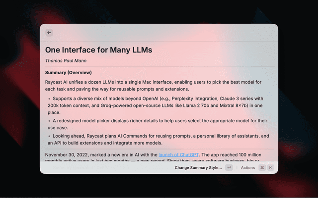 This extension's content extraction architecture was inspired by Defuddle, a content extraction library by @kepano. We initially attempted to use Defuddle directly, but found it wasn't well-suited for Raycast's environment: