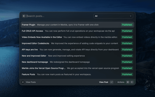 This extension lets you manage your Marble workspace directly from Raycast:
