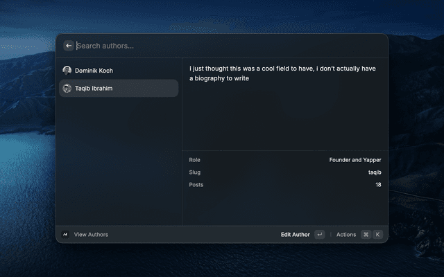 - Authors — Browse, create, edit, and delete authors with bio, role, and social links.