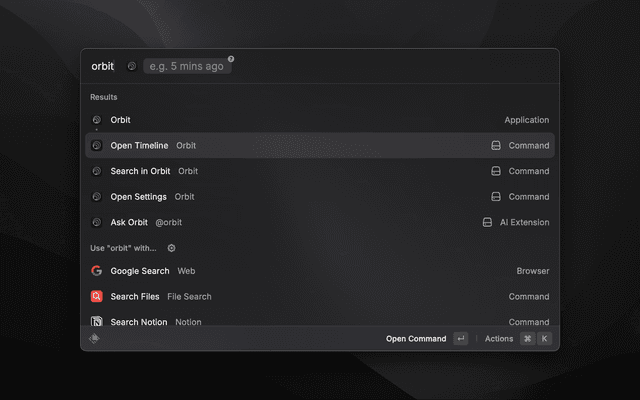 Control the Orbit macOS app with Raycast. Open the timeline, search your history, and jump to settings.