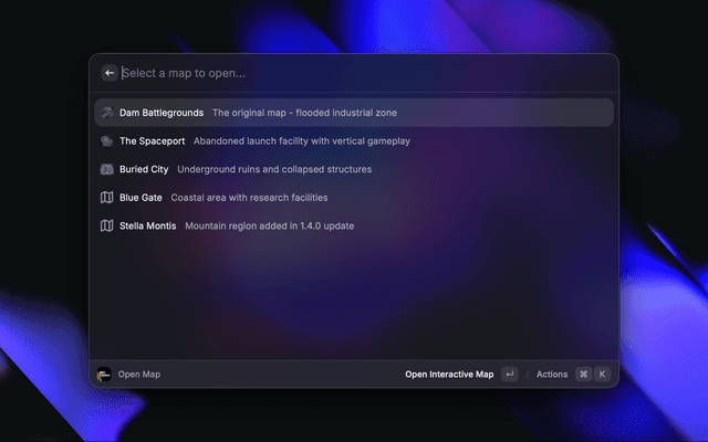 Open MapQuick access to interactive maps (Dam, Spaceport, Buried City, Blue Gate, Stella Montis)
