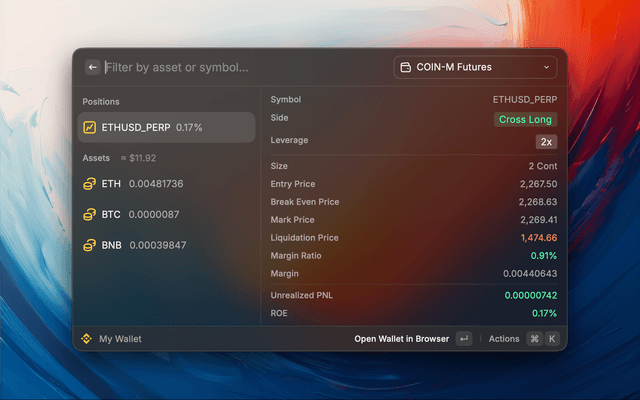 | My Wallet Menu Bar | See your Binance portfolio balance in the menu bar |